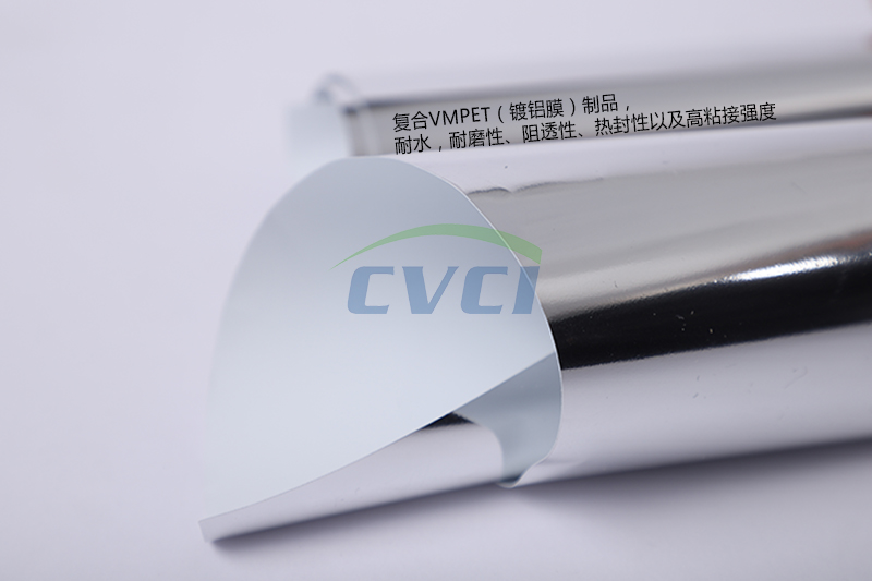復(fù)合VMPET(鍍鋁膜)制品,具有耐水,耐磨性、阻透性、熱封性以及高粘接強(qiáng)度,對(duì)紫外和紅外光具有良好反射性等產(chǎn)品特性。阻隔性性能指標(biāo)為:氧氣透過(guò)量cm3/(m2? 24h? 0.1Mpa)≤1.5,水蒸氣透過(guò)量(g/m2?24h)≤1.5。
