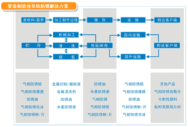 裝備制造業(yè)從原材料貯存,到加工制造、裝配、運(yùn)輸,每一個(gè)環(huán)節(jié)都會(huì)面臨銹蝕問題。該領(lǐng)域?qū)τ诜冷P產(chǎn)品具有需求范圍廣、個(gè)性化要求高、技術(shù)支持需求明顯等特點(diǎn)。我們按客戶材質(zhì)、工藝和儲(chǔ)運(yùn)要求,進(jìn)行系統(tǒng)的防銹防護(hù)解決方案。已成功完成小到微型電機(jī)、大至成套工程機(jī)械的防銹防護(hù)方案設(shè)計(jì)和多年驗(yàn)證工作。為我國裝備制造業(yè)發(fā)展保駕護(hù)航!