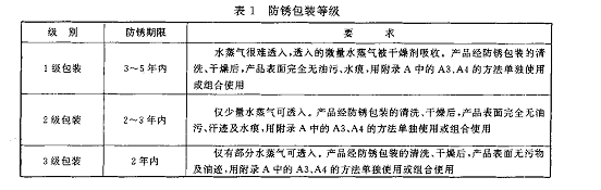 ①包裝的防銹等級應(yīng)根據(jù)產(chǎn)品的抗銹蝕能力、流通環(huán)境、包裝容器的結(jié)構(gòu)、包裝材料的一般性能等因素來確定,防銹包裝等級分為:1級包裝、2級包裝、3級包裝.詳見表1,